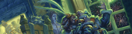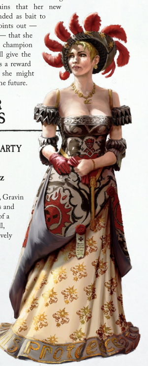 Mais première surprise d'une soirée qui en annonçait un certain nombre, la représentante de l'empereur n'était pas présente ! A sa place, c'est une vieille connaissance, le Colonel Olaf Sievers, paré de son éternel uniforme des Ostlanders impériaux, qui arriva. Le colonel, escorté par un chevalier panthère casqué, vint très vite à notre rencontre, seuls visages familiers au sein de ce guêpier d'intrigants. A peine parti du mariage des Saponatheim, un messager d'Emmanuelle Nacht lui avait intimé l'ordre de se rendre à cette soirée et d'étudier les différents prétendants à la gestion d'Ubersreik. Le colonel, homme d'action, était bien désemparé et aurait plutôt aimé se rendre la capitale plaider des renforts contre les peaux vertes du Col du Feu Noir. Je le comprenais bien et n'avais qu'une envie : m'éclipser. Comme le voulait le destin, la Gravin était elle aussi présente. Probablement sous l'autorité de sa tante. Elle ne leva même pas les sourcils en nous voyant, trop habituée à notre présence au mauvais endroit.