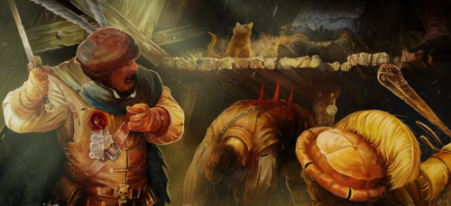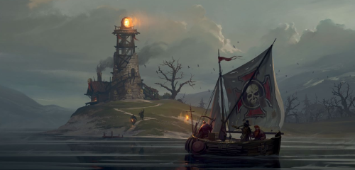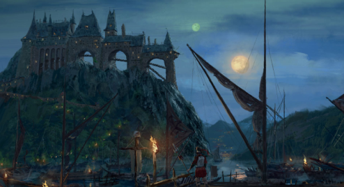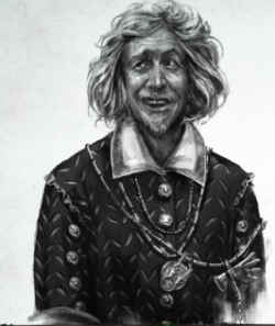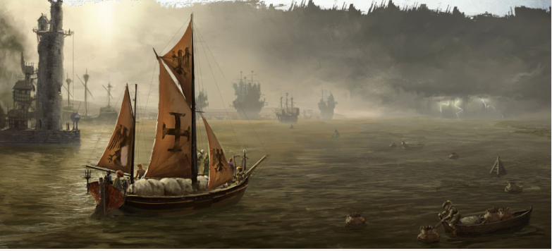 Deux gardes masqués approchent du navire et nous chantent une chanson de taxe qui flaire le mensonge. Je leur donne nos maigres économies mais ces brutes veulent toujours plus et semblent sur le point de nous amener au château. L'arrivée d'un autre navire interrompt leur tentative d'intimidation. Un homme descend à quai et laisse repartir le navire. C'est Descartes le bretonnien. Deux femmes, un homme et un chien sont de trop pour les deux gardes qui partent en maugréant. Nous n'avons que peu de temps et nous devons agir vite. Macuse l'aubergiste est notre seul allié en ville ou du moins je le pensais. Alors qu'il nous servait des verres, Descartes le prit par le col et braqua son pistolet sur sa tempe. Hund sentait lui aussi quelque chose de mauvais au sous-sol. Des cuves remplies d'une odeur pestilentielle. Macuse parla enfin. Il devait nous retenir le plus longtemps possible et c'était lui qui distribuait le tord boyau à ses frères et sœurs. Le bretonnien l'égorgea pour ses crimes et mis le feu à sa cave. Nos amis étaient prisonniers dans le château. Il fallait ruser. Renata conçut un stratagème simple. Nous déguiser pour rentrer dans la cour extérieure comme mendiants puis tenter de trouver les autres. La ruse passa aisément, les gardes relâchés, tuaient le temps en jouant aux cartes. L'un d'eux maugréa qu'il était en train de "louper la fête dans la cour intérieure". De quoi diable pouvait-il bien parler ?