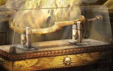 Mon courage me guida à travers la chapelle aux teintes rosacées où des individus s'adonnaient à la débauche la plus totale. Sous la statue de leur dieu vicieux, je trouvais un vieux sarcophage laissé à l'abandon où m'attendait Barakûl… une épée runique, forgée par les miens ! Un démon aux formes langoureuses sortit des fumées et m'invita à joindre la fête. Je pris mes jambes à mon cou et cacha l'épée au dessus d'une large grille. A l'heure fatidique, l'arme se révèlerait essentielle à la victoire de mes amis.
