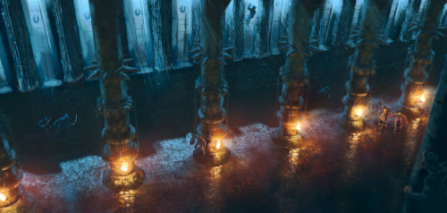 Aynjulls et son équipe amoindrie avaient terminé leur travail sur le fanal. Les ruines de l'observatoire étaient presque méconnaissables et un superbe miroir dominait désormais le Reik. Une autre surprise nous attendait : les corps dispersés de quatre mercenaires qui s'étaient établis près de l'observatoire. Une rapide inspection de leurs effets personnels nous révéla bien vite l'origine de ce charnier. Ces hommes avaient été commandités par Etelka pour s'occuper d'éventuels enquiquineurs (heureusement que les nains étaient déjà partis) et devaient attendre un "allié" pendant une semaine. L'allié les avait vraisemblablement trouvé. Les blessures connotaient un titan à la force colossale se battant avec une flamberge. Je n'osais imaginer qui pouvait être cet individu mais une part de moi se préparait à affronter un monstre pareil à la solde de la Couronne Rouge. L'individu mystère avait lui aussi déniché le sanctuaire souterrain et des traces autour de l'écoutille scellée laissaient à penser qu'il avait ouvert la porte scellée sans les clefs ! Quelle était cette sorcellerie ? Waltram m'assura qu'il n'existait que quelques sortilèges capables de réaliser une telle prouesse et notre intrus n'avait pas l'air très "intellectuel". Utilisant la dernière clef, nous descendîmes avec prudence. Personne. Nous lâchons un soupir de soulagement.