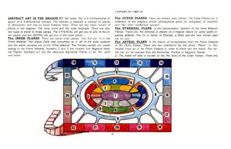 Et Gygax s'excuse même du dessin, indiquant que non ce n'est pas l'art abstrait mais juste ce qui est maintenant connu comme la première version de la grande roue de D&D. Je ne pense pas que Monte Cook et Bruce Cordell aient pu avoir ce numéro de Dragon, tant le magazine était alors minimaliste et distribué uniquement dans les universités.
