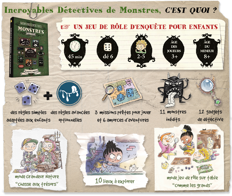 Occasion de rappeler que cet éditeur, après le FP 2022 de matériel supplémentaire pour Petits Détectives de Monstres à l'occasion de la réédition du Livre de base de 2017, est en plein FP 2023 pour INCROYABLES DETECTIVES DE MONSTRES qui est tout à la fois une suite qui complète et approfondit PDDM, mais aussi un ouvrage et ses outils par lequel on peut commencer directement.