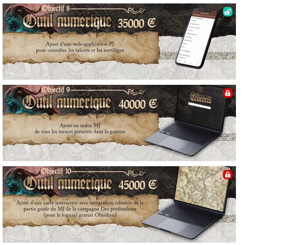 Un point de début de 1e semaine. Deux séries d'objectifs sont atteints permettant d'une part une trentaine de nouvelles illustrations, et d'autre par des enrichissements de la forme des livres. Une troisième série est en cours, avec des outils numériques pour les joueurs e tle MJ. D'ores et déjà le premier est atteint.