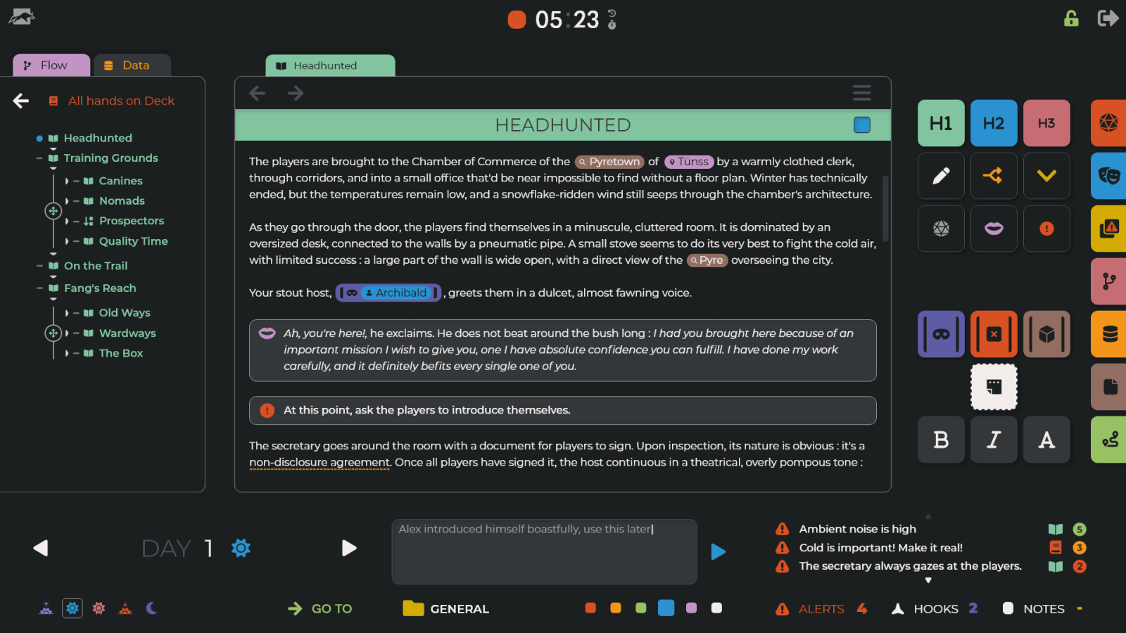 - Un système d'alertes, qui permet de se souvenir de certaines informations notées à la volée plusieurs sessions plus tôt à des moments-clef.