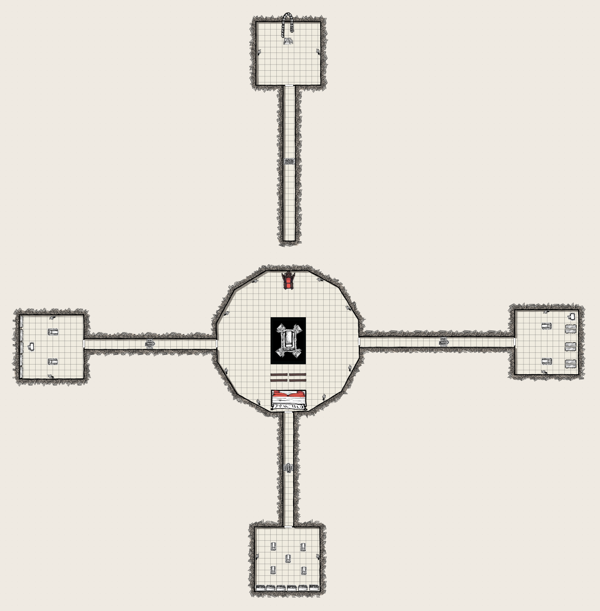 A noter que la salle centrale annoncée circulaire contient "une grande statue de guerrier occupe chacun des coins" => la salle était sans doute carrée dans une première version du scénario. Donc question à Laurent Bernasconi : est-ce qu'il y a bien 4 statues de prévues ?