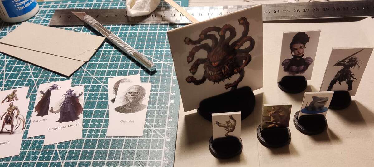 Mes premiers essais pour tester les épaisseurs de carton, par rapport à un usage de socles PF (le beholder avec 1 épaisseur flageole un peu sur le socle, les autres avec 2 épaisseurs tiennent nickel) :