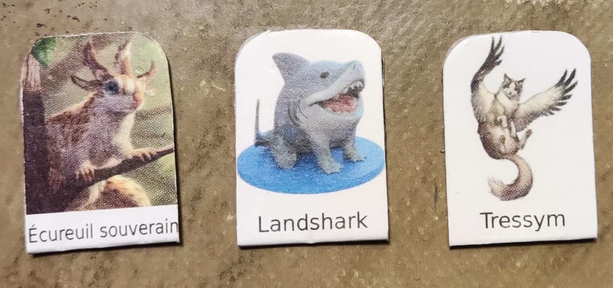Je colle l'illustration de chaque coté de chaque côté, avec un des côtés où j'utilise de la longueur pour enrober le bas (réduire les chances d'arrachage en mettant le pion dans un socle).