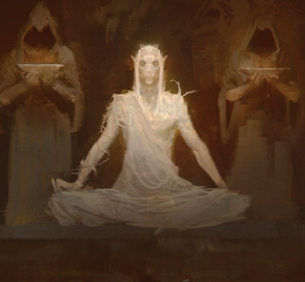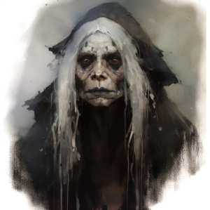 Le vieil homme était prudent. Sortant peu de chez lui mais certains "signes" ne mentaient pas. Pourquoi la lumière restait allumée à une heure avancée de la nuit ? L'homme était veuf, sa famille emportée par les Sombres Seigneurs. Quelque chose clochait et le changelin de Karvosti ne pouvait réfréner sa curiosité. Il se changea en petite souris, pénétrant dans la luxueuse demeure. Le vieillard maugréait à demi endormi dans son salon mais un bruit sourd résonnait sous ses petites pattes. Geraël se glissa sous une porte vérouillée au sous-sol. Dans une chambre accomodée des plus belles parures, une femme et une enfant de noble extraction l'observait, lui, la petite sourire. Leur peau était grise, leur bouche couverte de sang. Au sol, de la barbaque pourrie à demi entammée.