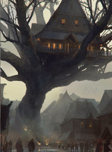 Les frères Merkele résidaient depuis deux jours aux Salons de Symbaroum, une auberge qui remplaçait l'ancienne résidence du maire… au sommet d'un immense arbre dominant toute la ville. Geraël se désigna pour partir en reconnaissance. Se changeant en chouette, il vola jusqu'aux feuillages les plus élevés. Arrivé sur le "sol" de l'auberge, il tint en respect son vertige pour trouver la chambre des frères Merkele. Un tour de passe passe plus tard, il devenait garçon de cuisine, mandaté par le chef pour aller porter un repas à un "templier" laissé seul en convalescence dans sa chambre. Parfait !