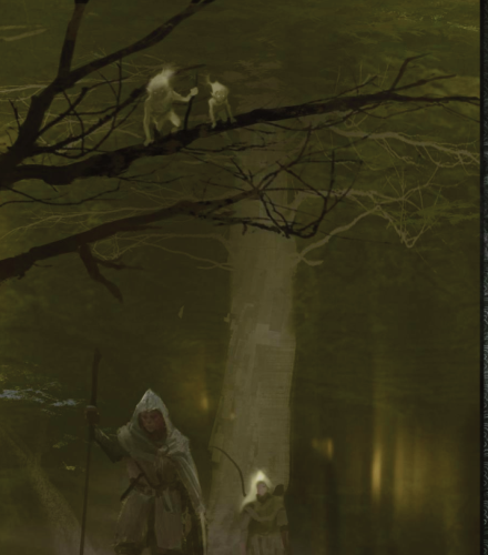 Des elfes, grands et petits, traversaient un champ de bataille. Partout autour d'eux, les morts étaient légions. Sur leur passage, des arbres poussaient. La fresque se terminait par un conseil entre les elfes et les hommes. Lambin reconnut certains des sigils de l'humanité, intégrés depuis dans les tatouages des clans de Davokar… ainsi qu'un symbole rappelant… la maison Korinthia ?