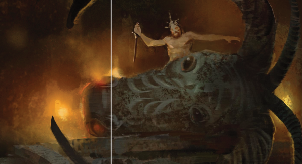 En s'approchant du wagon des deux frères, ils furent accueillis par l'un des éclaireurs, prêt à se battre pour sa vie. Le combat fut interrompu par une bête immonde qui bondit hors de la caravane. Devant son frère médusé, le plus corrompu des deux était né une seconde fois : de grandes cornes sur son front et un corps allongé à l'aspect primal. L'abomination menaçait femmes et enfants. Il n'en fallut pas plus pour sceller son sort. Le triomphe vint à nos héros mais plus difficilement. La bête était coriace et mûe par la faim terrible des nouveaux nés. Après quelques minutes, elle rendit enfin son second souffle. Son dernier.