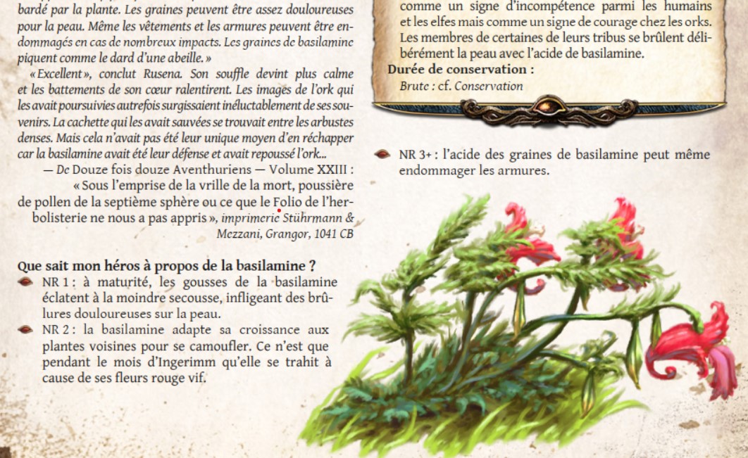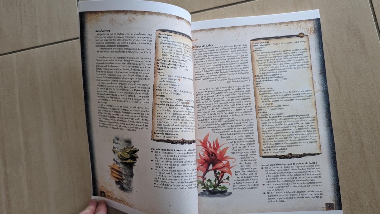 Littéralement bluffé par l'Herbarium [aventurien], mon imagination tourne à plein régime, toutes ces plantes, puis l'alchimie... Impressionnant ce bouquin, même le traité de flore de Rêve de Dragon que je surkiffe est battu en brèche par cette véritable encyclopédie florale de l'Aventurie !