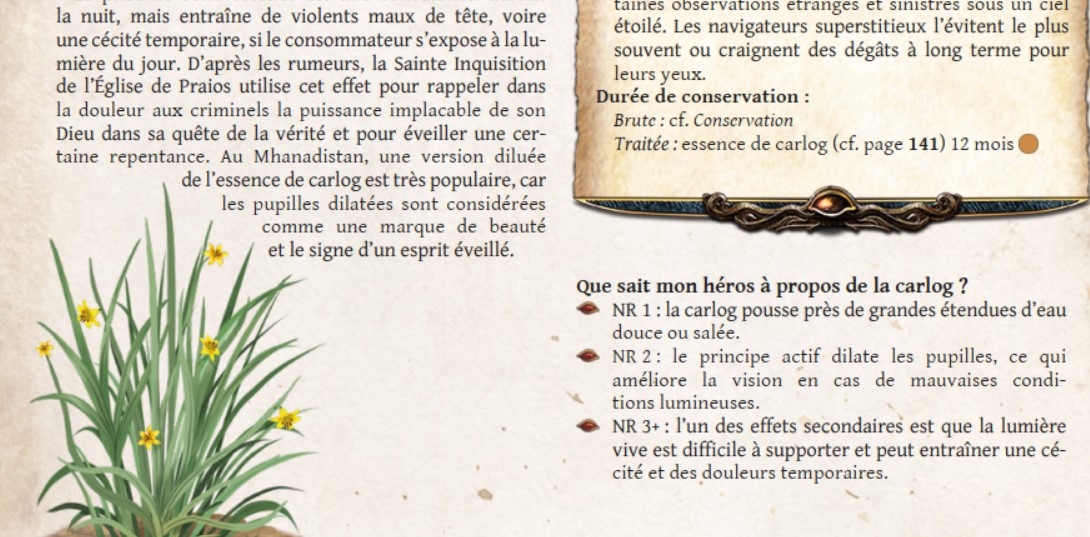 En effet, ce supplément PDF peu coûteux (20 euros) contient de très nombreuses descriptions de plantes hautes en couleur (1 page entière par plante ) ainsi que des recettes pouvant être faites avec ces dernières ... et très clairement je pense m'en servir potentiellement pour d'autres JDR que l'Oeil noir.