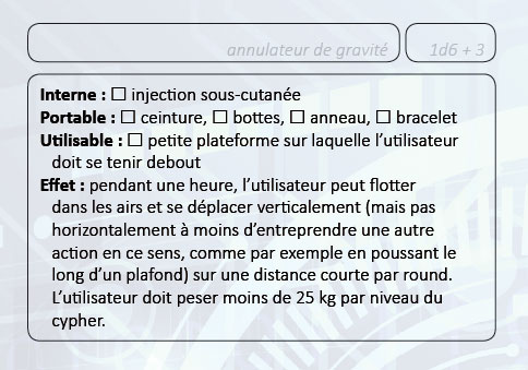 Vous avez trouvé une solution pour optimiser ça ? Des cartes effaçables pré-remplis ? Des fiches imprimées avec une zone pour noter le niveau du cypher ? Le tout triplé pour faire varier les descriptions ?