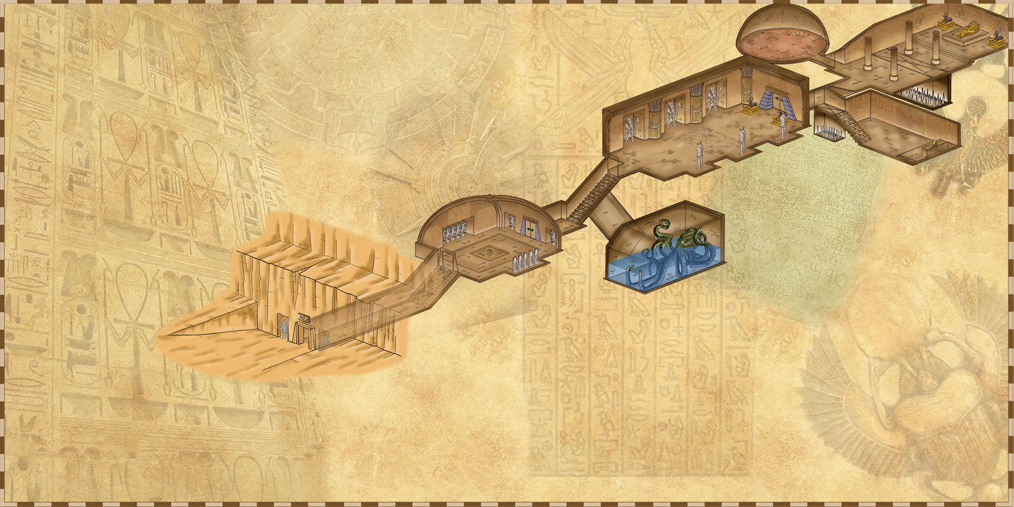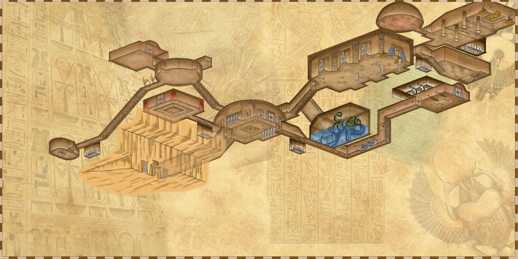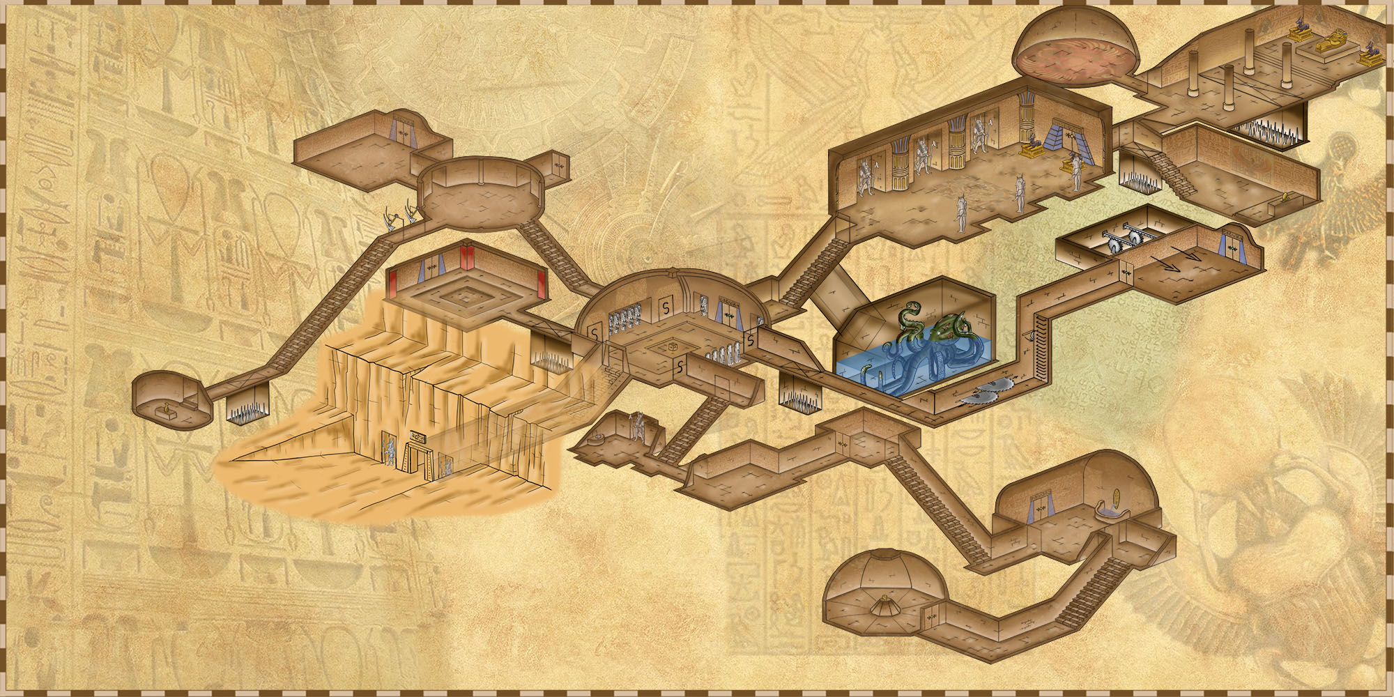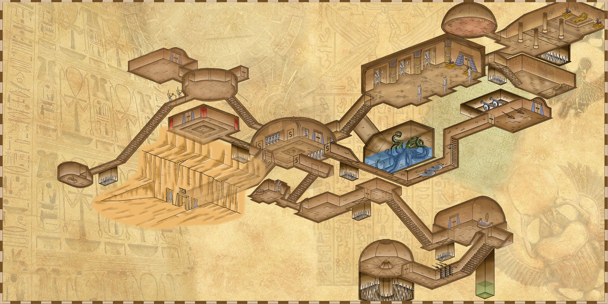 La tombe dévoilant ses pièges et sa pauvre pieuvre zombie qui se morfond dans son trou. Les pièges magiques ne sont pas représentés.