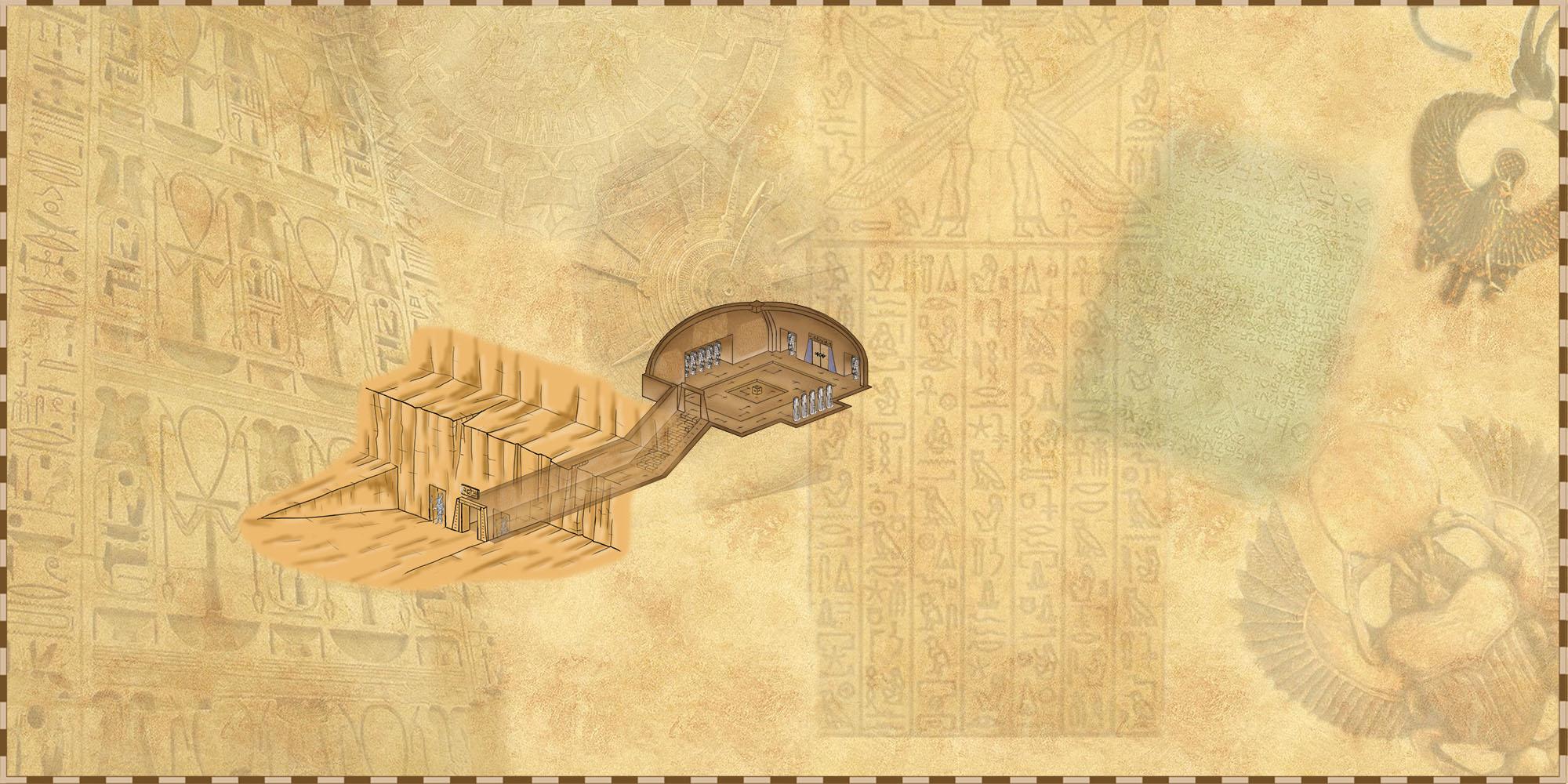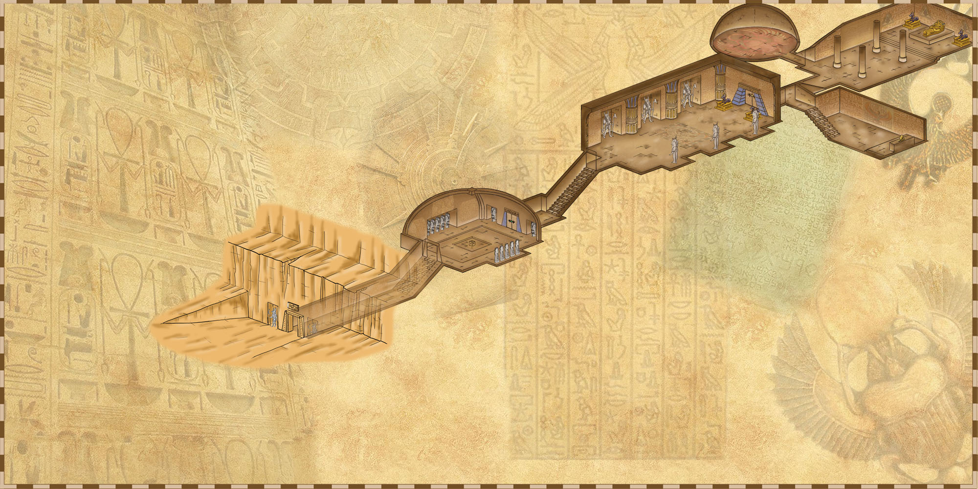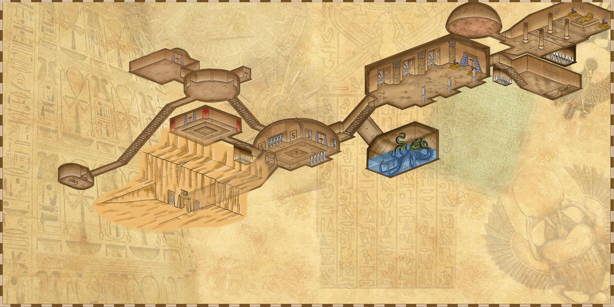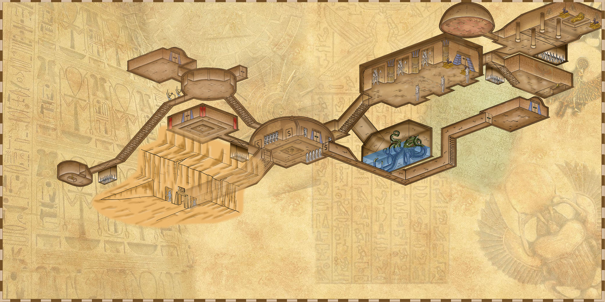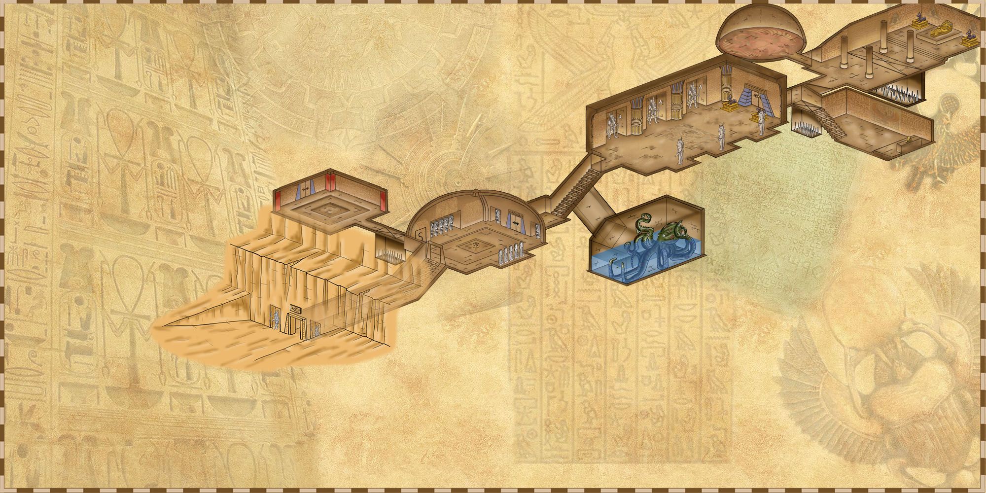 La tombe dévoilant ses pièges et sa pauvre pieuvre zombie qui se morfond dans son trou. Les pièges magiques ne sont pas représentés.