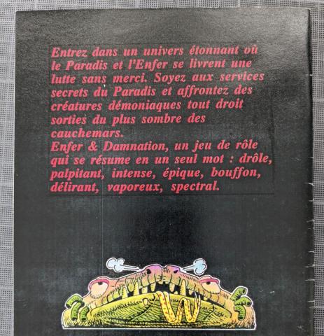 Ah et le thème d'Enfer & Damnation ? Les joueurs sont des agents du Paradis et luttent sur terre contre les agents et créatures de l'Enfer, mais en mode fun & comédie. A noter que le jeu est paru en même temps qu'In Nomine Satanis, je réfute donc toute déclaration de plagiat de thème