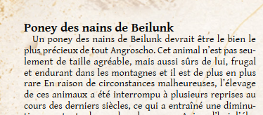 Voilà, dans le livre de règles il y a un archétype de nain de l'enclume guerrier (de mémoire). Il a des points en équitation. Du coup cela voudrait dire qu'il peut avoir une monture mais je n'ai rien trouvé comme exemple dans les livres en français pour le moment. Je lui donne un double poney? (parce qu'un cheval il faut faire 1m40 ou un truc du style pour pouvoir le monter alors c'est un peu juste pour un nain). Je suppose qu'on peut trouver des animaux exotiques mais sans être exotique, une monture passe partout, vous donnez quoi?