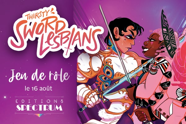 Créé par April Kit Walsh et publié par Evil Hat dans sa version originale, Thirsty Sword Lesbians rend hommage aux amours, à l'énergie et à l'existence des personnes queer. Si vous aimez les JdR, le second degré et les personnages lesbiens tiraillés par leurs émotions, alors ce jeu est fait pour vous ! Au programme : du flirt, des duels à l'épée et de la répartie cinglante, le tout servi par une interprétation novatrice du système Powered by the Apocalypse et conçue pour jouer du drama en toute sécurité émotionnelle. Et pas de panique : vous n'aurez pas besoin d'être à l'aise en flirt ou en répartie pour prendre part au jeu. Tous les personnages de TSL ne sont pas nécessairement doués avec les mots. Les lesbiennes timides ou maladroites aussi peuvent trouver l'amour ! Vous les trouverez bien représentées dans le jeu.