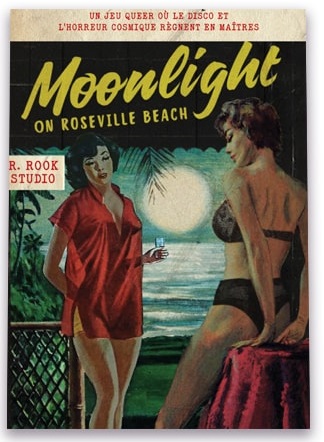À noter parmi les options possibles : un autre jeu traduit par les éditions Spectrum : Moonlight on Roseville Beach, un jeu mêlant horreur cosmique et thèmes LGBT+. Le pitch : aux États-Unis en 1979, les personnages appartiennent à des minorités LGBT et partent en vacances dans un coin connu pour être un lieu de rencontres. Mais ils doivent rester discrets face au risque de descentes de police... et se retrouvent aussi confrontés à des fantômes, à des nécromanciens, à des métamorphes, à des esprits du lieu antédiluviens et à des divinités anciennes. Ça nous prépare des vacances pas reposantes, tout ça... Le livre fait 164 pages en A5, on peut le prend en papier ou en PDF, ça se joue avec des d6, et vu la couverture, ça pastiche les romans de gare gentiment érotiques d'il y a 50 ans.