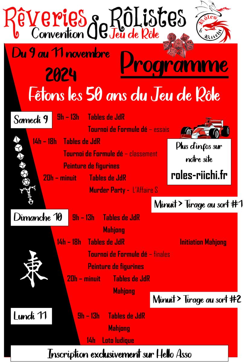 A l’occasion des 50 ans du jeu de rôle, nous allons organiser notre première convention de jeu de rôle qui se tiendra du 9 au 11 novembre 2024.