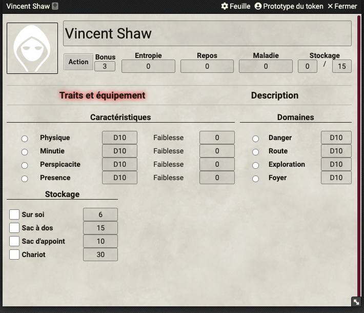 Commençons par la base, la fiche de personnage :
