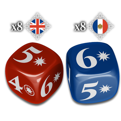 Les dés ont une étoile à côté du 5 et du 6 pour signifier qu'il y a une touche. Et une étoile entourée à côté du 4 pour indiquer un recul. Des D6 normaux peuvent cependant très bien faire l'affaire.