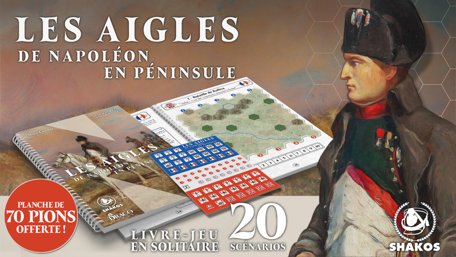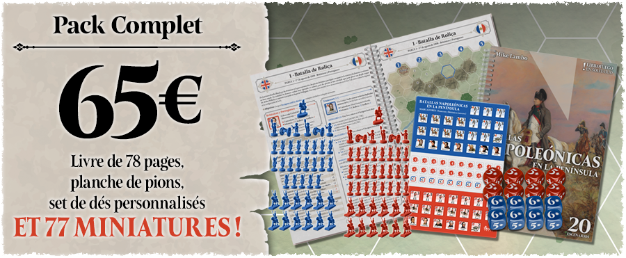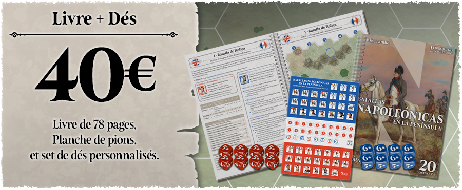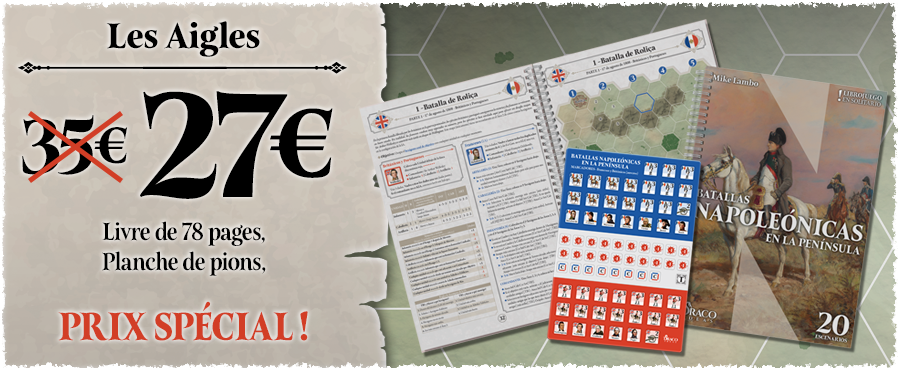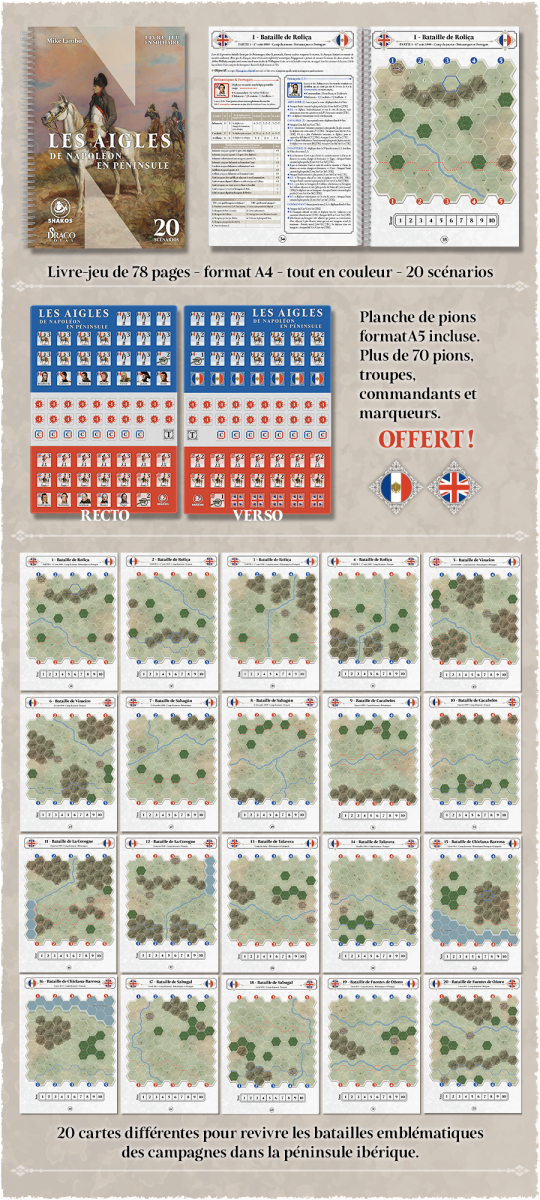 Vous avez toujours rêvé de vous lancer dans le jeu de stratégie historique sans oser par manque de temps, de place, de joueurs ou par peur d’une complexité trop importante ? Les Aigles de Napoléon en péninsule vous propose un livre-jeu de 78 pages comprenant 20 scénarios de batailles pour enfin pouvoir mener vos troupes à la victoire. Planche de pions incluse pour vous lancer immédiatement dans la bataille !