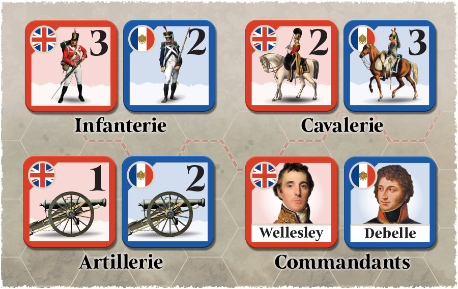 Un petit visuel des pions ci-dessous. Non, il n'y a pas d'orientation, le système étant simplifié pour ne pas avoir à gérer cette complexité. Dans les 2 cas, il faut utiliser des marqueurs qui sont sur la planche de pions, lorsque les unités d'infanterie sont en Carré. Chaque unité a une force, de 3 à 0. Quand tu joues avec les figurines, tu en mets 3 si l'unité est de force 3, 2 si elle est de force 2... On peut aussi en utiliser une seule en utilisant les marqueurs perte de la planche de pions si on a peur de tout renverser.