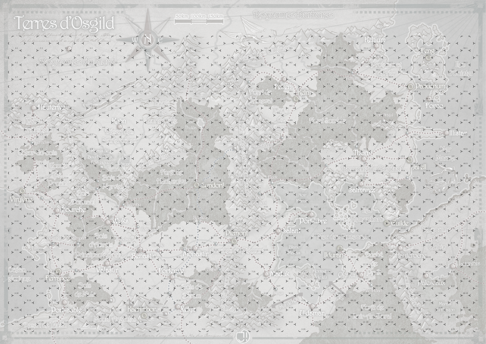 Et surtout... Les cartes n'ont aucune échelle. Ça je trouve que c'est vraiment mal. Depuis le temps qu'on fait des cartes en JDR, donner l'échelle dessus soit en km, soit en temps de trajet me semble indispensable et automatique. Perso je regrid les map en hexagone de temps de voyage. Une fois pour toute pour éviter les questions en cours de jeu ^^ c'est moche mais utile ! Parce les km c'est bien joli mais c'est pas vachement pratique en jeu, faut compter, etc. la les hexa c'est top. Les carte Macro 1 Hexa = 1/2 journée ou 1 journée. En micro 1 Hexa c'est 1h. Et paf y a qu'à compter :" on est là, on va là".
