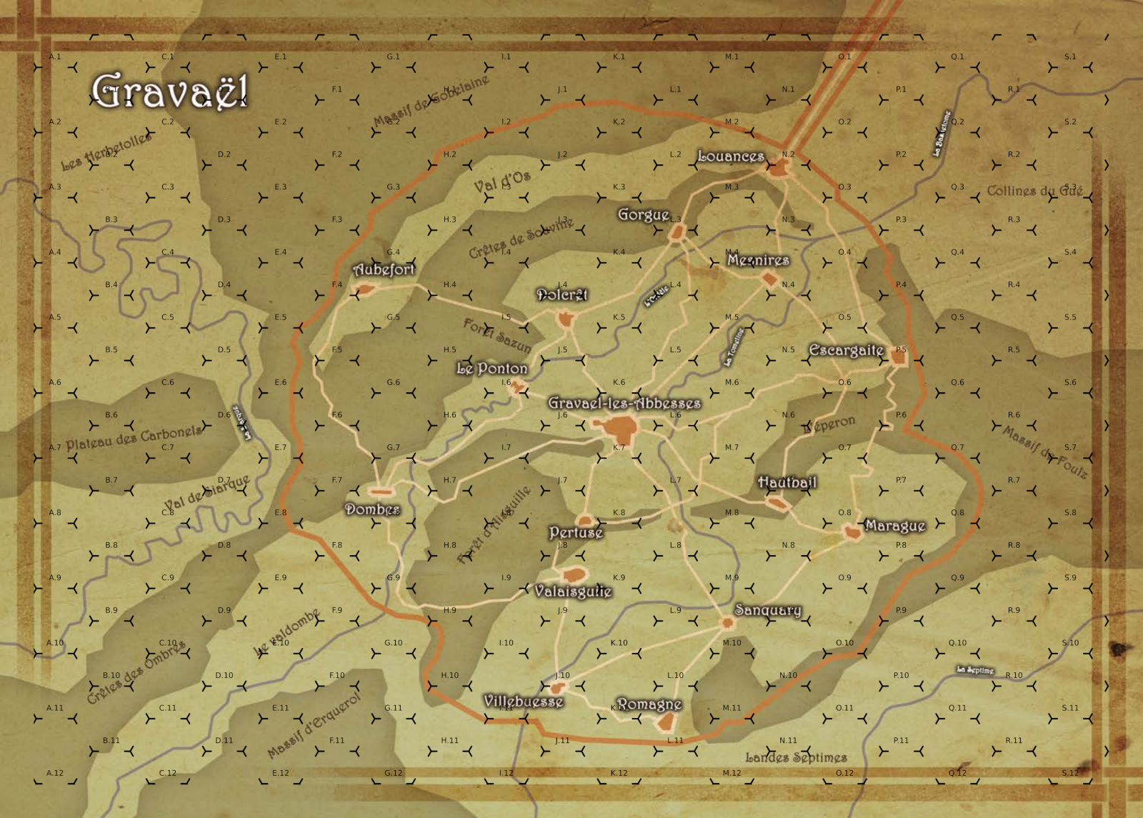 Alors voici ma carte de Gravael hexée. un hex fait 1km environ. il y a 12 hex d'est en ouest.