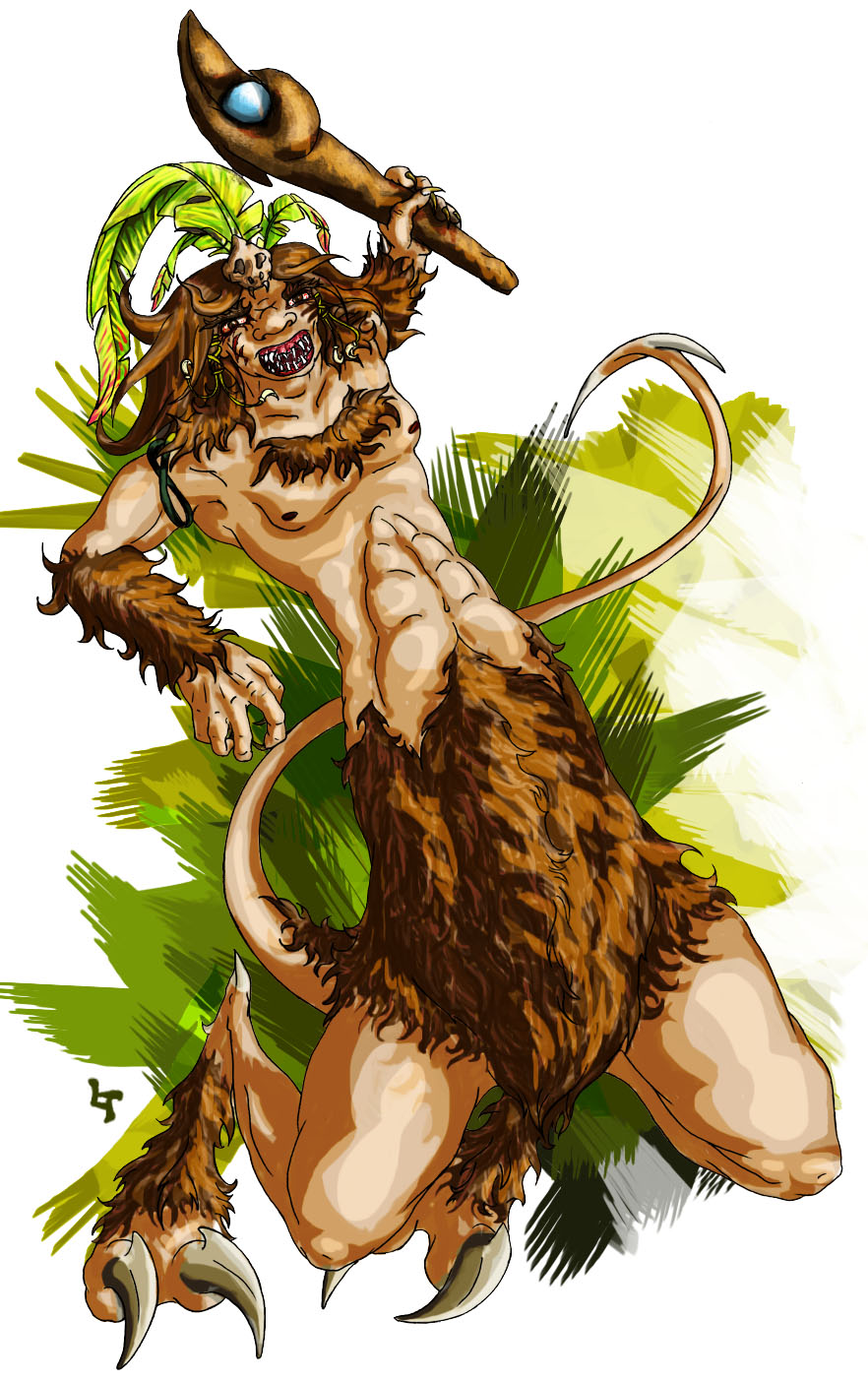 Très territoriaux, les brushtas sont sédentaires. Le clan vit dans la même grotte profonde, toujours aux abords d'un cours d'eau. S'ils ne maîtrisent pas la magie pour la plupart, l'un d'eux, une femelle la plupart du temps, devient une sorte de chamane et transforme les pierres en objets magiques que les membres du clan introduisent au bout d'un morceau de bois pour en faire un gourdin efficace. Si la partie haute du corps ressemble à celle d'un homme sauvage, la partie basse se développe en long bassin couvert d'un épais pelage brun et deux jambes très musclées aptes à faire des bonds vertigineux. Les pattes se terminant par deux énormes griffes. Ils possèdent également une queue munie de deux crochets pointus. Les brushtas se déplacent sur deux ou quatre pattes et sont aussi à l'aise au sol que dans les arbres.