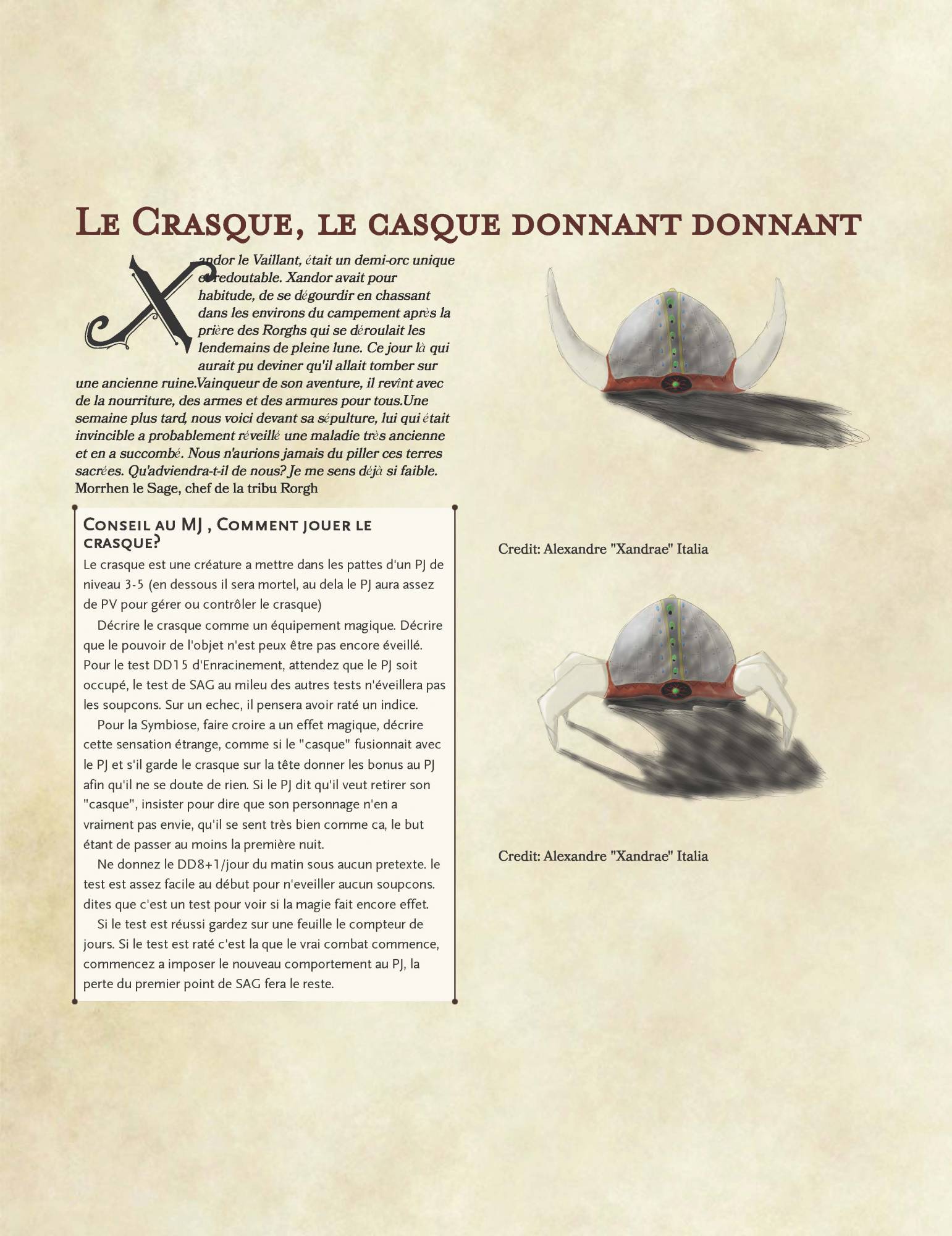 Aura magique: Le crasque dissimule sa véritable nature derrière une aura qui trompera les PJ en faisant croire que le crasque est un casque magique.