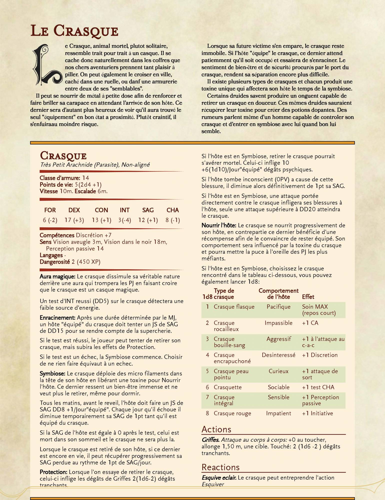 Si l'hôte est en Symbiose, choisissez le crasque rencontré dans le tableau ci-dessous, vous pouvez également lancer 1d8: