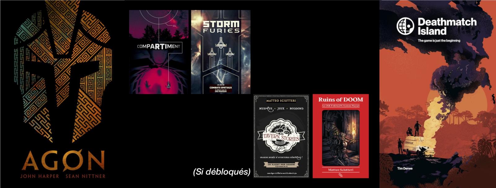 Ça y est, c'est fait : AGON et DEATHMATCH ISLAND sont financés ! Les contributeurs ont d'ores et déjà reçu un lien vers les textes complets des deux jeux, ainsi que vers deux playsets qui permettent de se lancer dans le système Paragon grâce au DRS du système, également disponible.