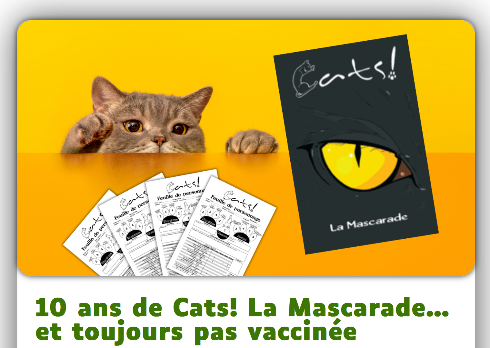 Je me permets de poster ici pour partager un petit jalon personnel, qui, je crois, parlera à plus d’un rôliste. Ce 7 juillet 2025 marque les 10 ans jour pour jour depuis ma toute première partie en tant que MJ sur Cats! La Mascarade. Une découverte à l’époque, un coup de cœur immédiat… et un jeu qui ne m’a jamais quittée depuis.