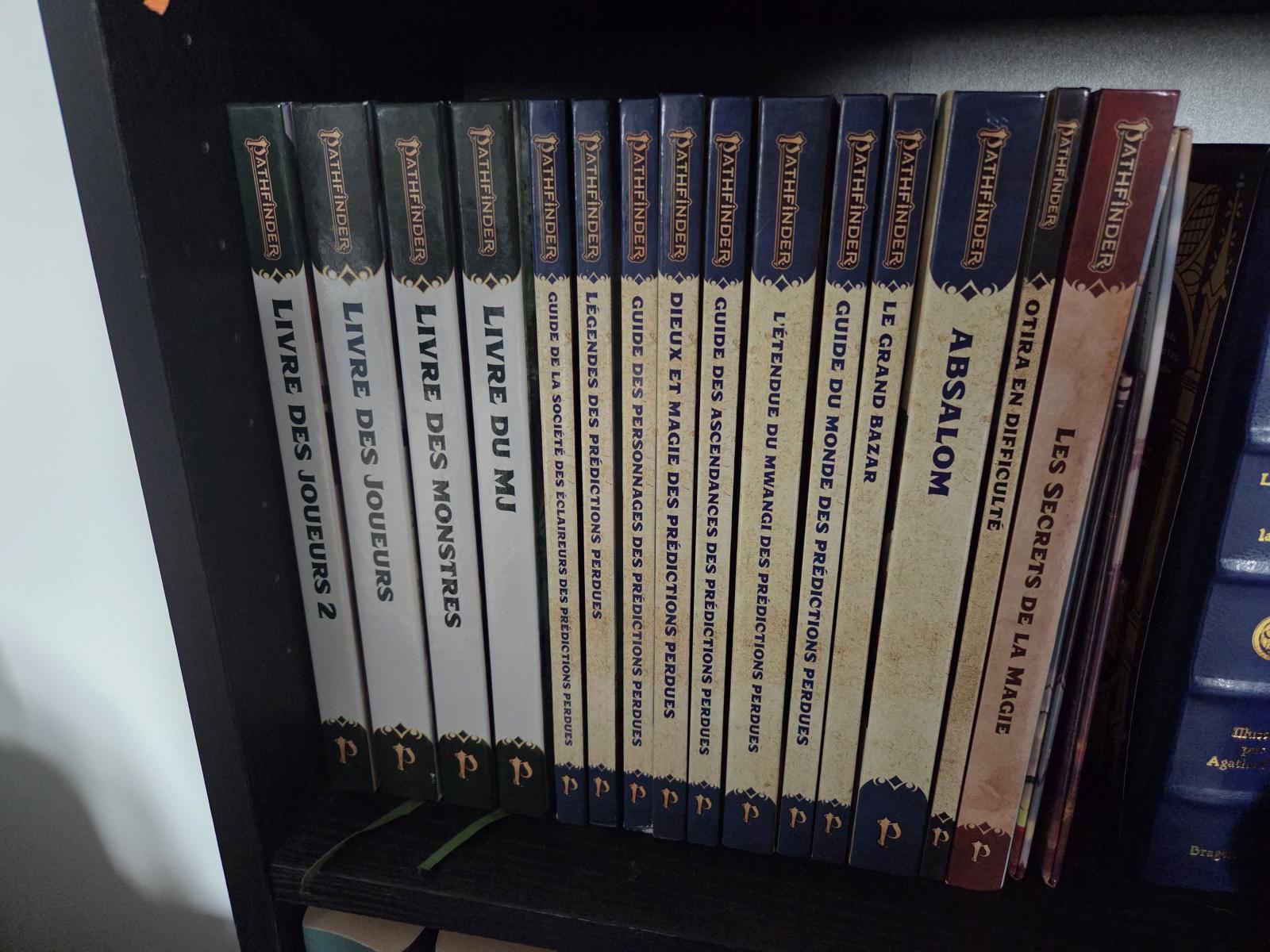 Livre du joueur (Remaster) – Neuf : 59,90 € / Proposé : 45 €Livre du joueur 2 (Remaster) – Neuf : 59,90 € / Proposé : 45 €Livre du MJ (Remaster) – Neuf : 59,90 € / Proposé : 45 €Livre des monstres (Remaster) – Neuf : 59,90 € / Proposé : 45 €Secrets de la magie – Neuf : 49,90 € / Proposé : 39 €Écran du MJ – Neuf : 29,90 € / Proposé : 20 €Guide des ascendances des Prédictions perdues – Neuf : 36,90 € / Proposé : 28 €Guide de la Société des Éclaireurs – Neuf : 34,90 € / Proposé : 28 €Absalom, cité des Prédictions perdues – Neuf : 54,90 € / Proposé : 40 €Grand Bazar – Neuf : 34,90 € / Proposé : 28 €Otira en difficulté (scénario) – Neuf : 25,00 € / Proposé : 18 €- Guide du monde des Prédictions perdues – Neuf : 35,00 € / Proposé : 20 €