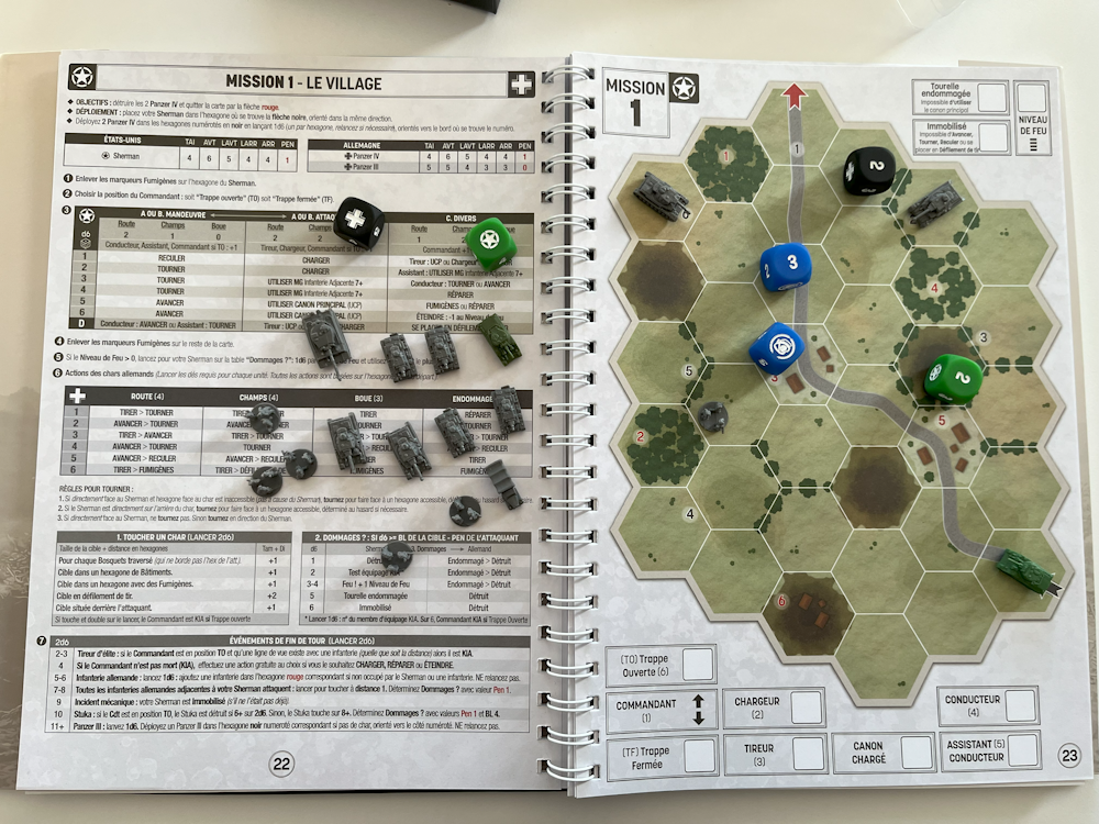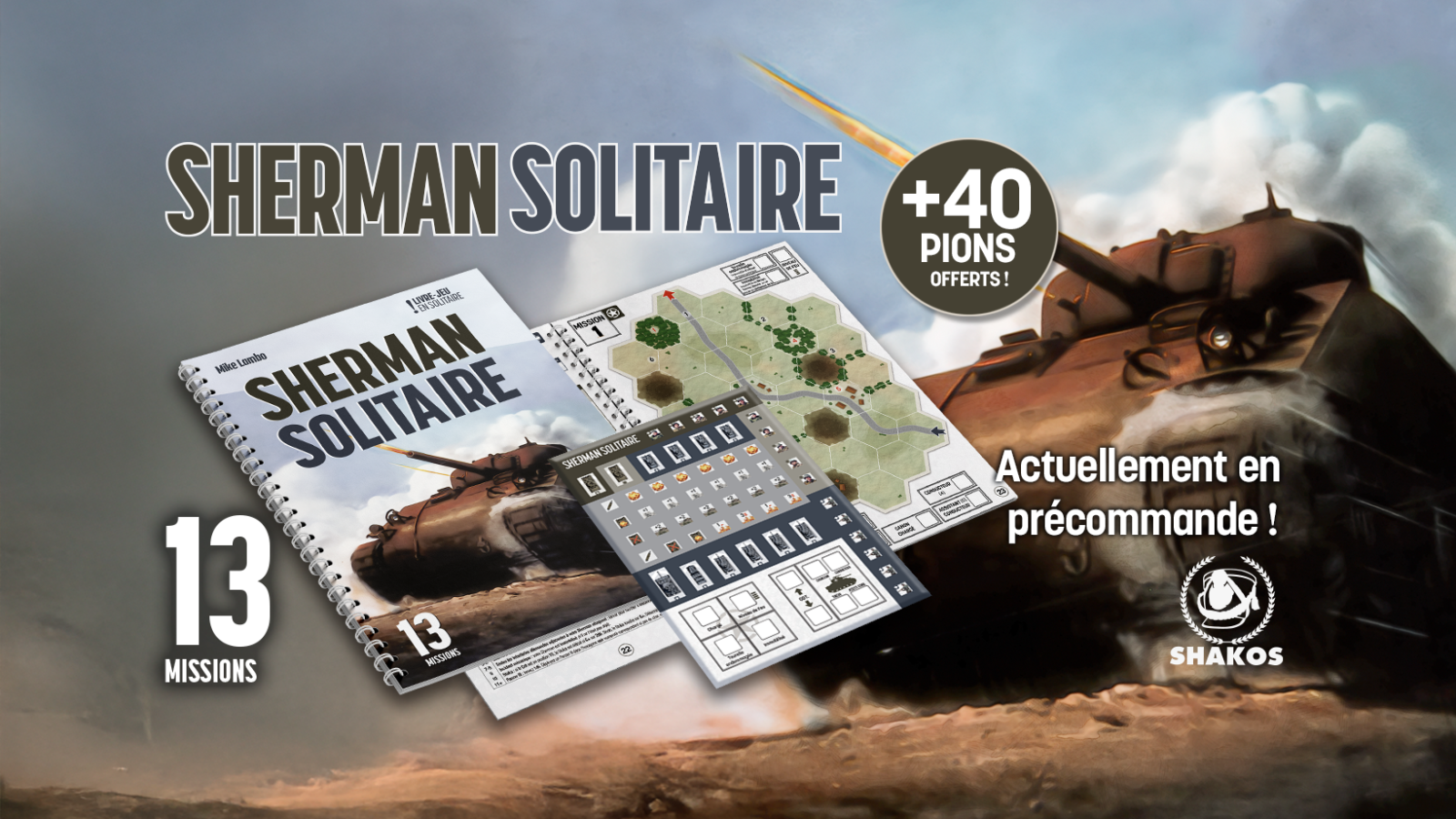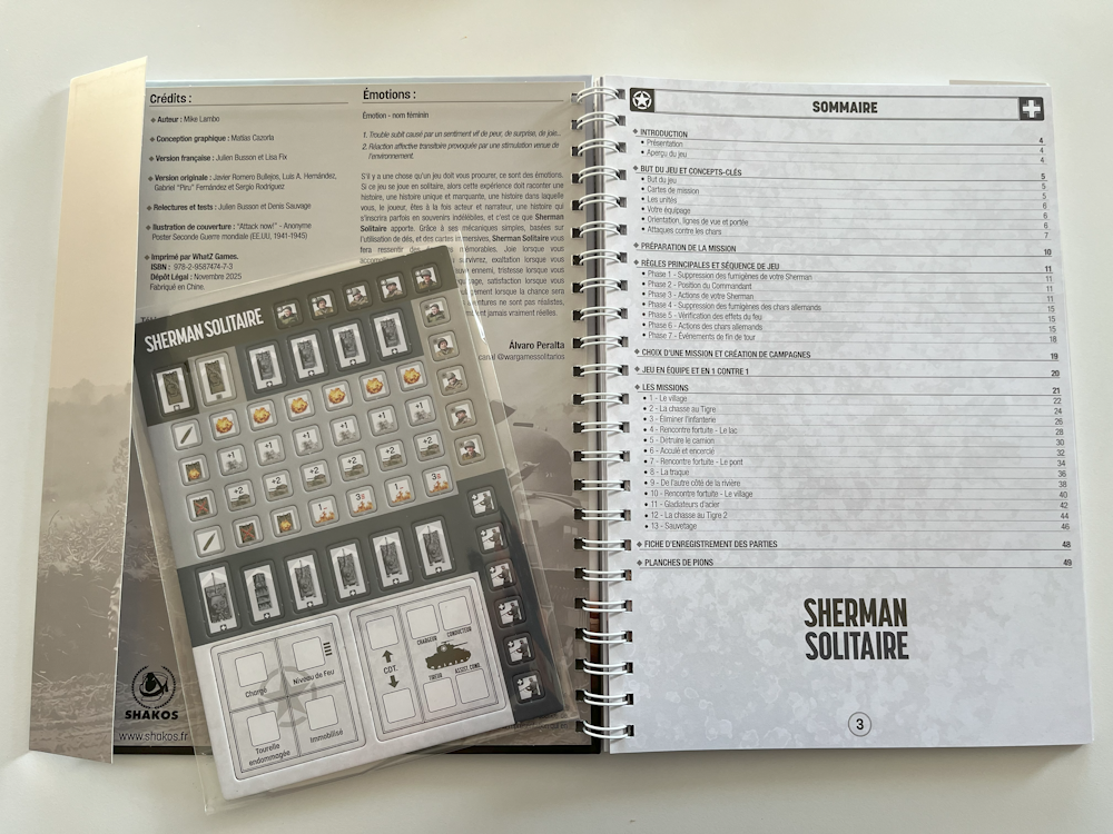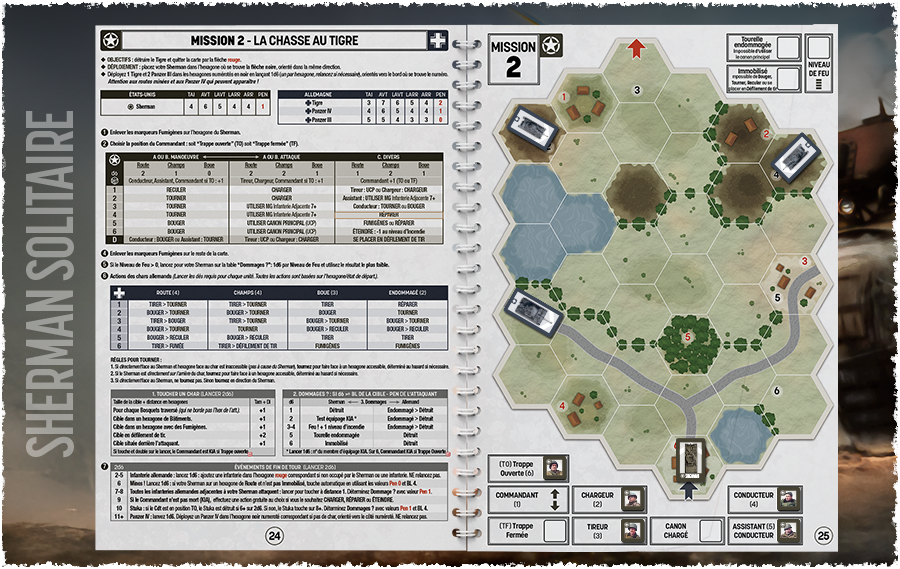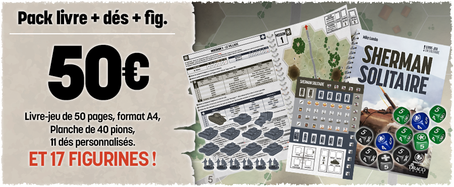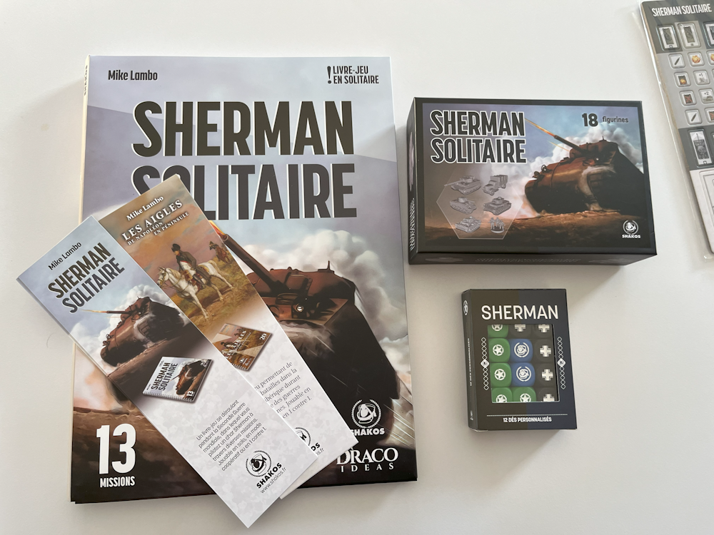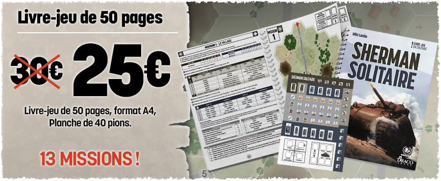 Vous avez toujours rêvé de vous lancer dans le jeu de stratégie historique sans oser par manque de temps, de place, de joueurs ou par peur d’une complexité trop importante ? Après Les Aigles de Napoléon en péninsule, nous vous proposons un nouveau livre-jeu vous mettant aux commandes d'un char Sherman et de son équipage pendant la seconde guerre mondiale, Sherman Solitaire. Affrontez les troupes allemandes (dont le fameux Tigre) dans 13 missions aux objectifs variés. Planche de pions incluse pour vous lancer immédiatement dans la bataille !