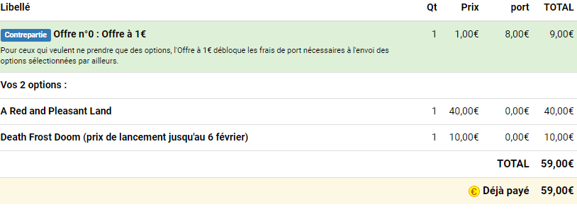 Bonjour à tous, je revend mon pledge de Lamention of The Flame princess, contenant " A red and pleasant Land " et "Death Frost Doom", le tout vendu à 60e - par paypal. Si intéressés...