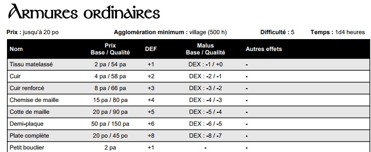 Je ne comprends pas, est-ce que l'armure de base qui offre +1 en Déf et -1 en Dex coute 2 PA, et si on l'évolue en armure +1, dans ce cas elle coute 54 pa mais offre +2 DEF et sans pénalité DEX? Ou seulement +1DEF -0DEX?