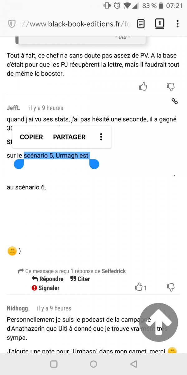 au scénario 6, le J. , je l'ai ultra-boosté, double PV, +2 Att/Def, +3 DM, avec une attaque combo griffes contagieuses +morsure vampirique. Mes joueurs ont eu vraiment peur, l'archer s'est pris 2 flèches et a perdu 2/3 de ses PV et le barbare la combo griffes/morsure avec un joli 52 DM, il n'a pas fait le fier malgré c'est 70PV (c'était sur le seul perso sur qui je pouvais faire cette attaque, les autres seraient morts