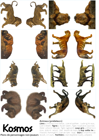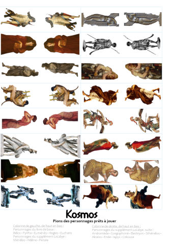 Ce mois-ci, je vous propose quinze planches de pions pour représenter les PJ et les principaux PNJ de Kosmos. Issus d'images du domaine public, tableaux ou même vases grecs (et après pas mal d'heures de boulot pour détourer, ajuster et disposer tout ça...), ils matérialiseront les personnages prêts à jouer du livre de base et du supplément La Libye, ainsi que les PNJ typiques du jeu et l'ensemble de son bestiaire, faune naturelle et créatures extraordinaires. Le mode d'emploi fourni avec vous indique comment découper et monter ces pions, selon le type de socle que vous souhaiterez utiliser.