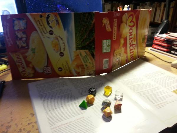 On peut aussi faire un écran en coupant une vielle boite de chocapic (mais le petit chien fait moins peur que le dragon de D&D) et accrocher les aides de jeu avec des trombones et tout cela sans etre un bricoleur confirmé. (faut etre un pingre confirmé par contre)