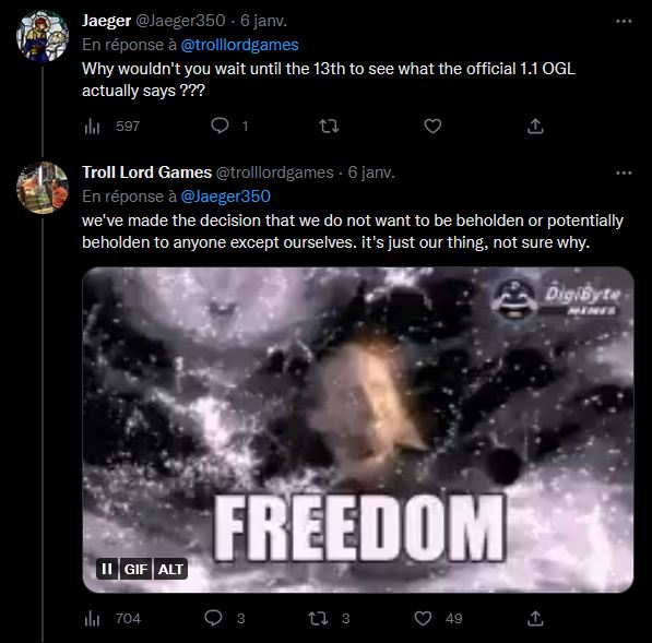 Ils ne pourront s'exprimer que lorsque l'OGL sera "finalisé", ils ont plusieurs move possible qui va du clash totale (L'OGL 1.1 ne peut remplace l'OGL 1.0) à la ré écriture des régles sans aucune référence à l"ensemble. Je pense que c'est possible vu comment ils se sont éloignés de la 3.5 petit à petit. Ils peuvent supprimer (ce que tout le monde va faire) l'OGL 1.0 de leur bouquin et attendre le move de WoTC aussi