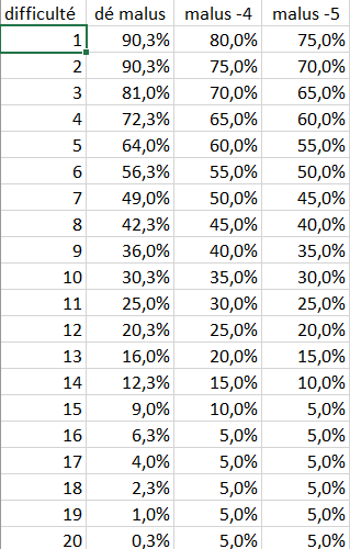 Je suis entièrement pour le malus, pour l'ajustement et la possibilité de cumuler avec d'autres conditions. En revanche, utiliser un malus de -4 ne rend pas vraiment les boss plus difficiles à toucher que le dé malus (en grande partie parce que le 20 est une touche automatique). Voici un tableau qui montre que le seul haut seuil plus difficile à atteindre avec -4 qu'en dé malus, c'est 16. Enfin, sauf erreur de ma part, bien sûr.