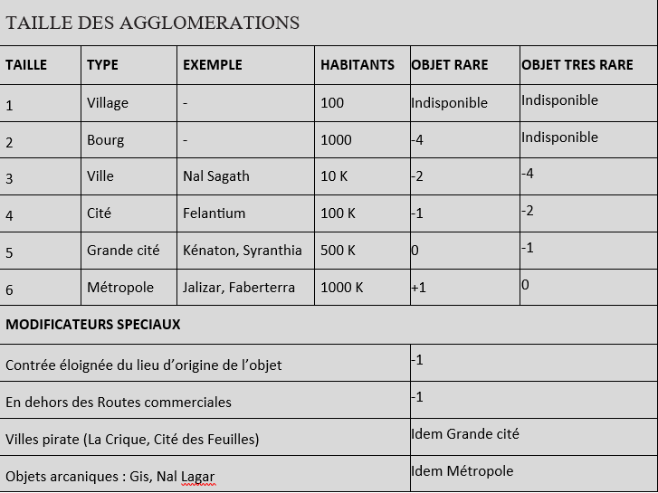 Disponibilité. Le malus au jet de réseau pour trouver un objet Rare ou Très rare dépend de la taille de l’agglomération, et est modifié comme indiqué dans le tableau ci-dessous. Ce malus traduit davantage le manque d’opportunité dans les villes plus réduites à trouver un objet spécifique.