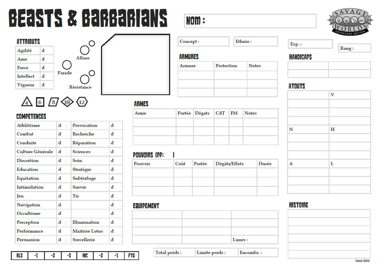 je me suis fait une fiche de perso pour B&B (le jdr, pas l'hotel content c'est pour la déclinaison swade (honte sur moi je n'ai encore entamé la lecture ni de B&B, ni de swade) j'aime bien avoir une fiche claire pour chacun de mes jdr - j'avais commencé avec des fonds de page parchemin et ça a fini sur un ton plus fun mais sobre niveau couleurs - j'espere n'avoir rien oublié sur les éléments propres au moteur swade et particularités b&b - aux 5 compétences à d4 j'ai inscrit un "4" en gris très clair comme ça qd ça augmente le joueur peut écrire par dessus sa nouvelle valeur