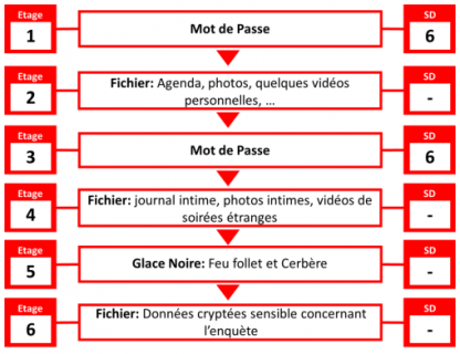 Euh dans l'exemple précédent, il y a deux jets à faire pour craquer les mots de passe... Pour le reste, il faut juste décider si tu explores l'étage en cours ou si tu continues. Pas plus compliqué qu'un donj' du plus vieux des Jdr.