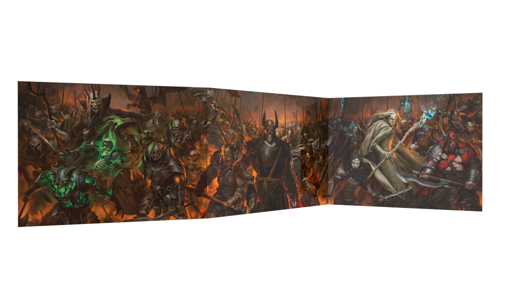– Un écran de maître de jeu en trois panneaux. Une superbe et intimidante illustration d’Alexey Kim rappellera en permanence à vos joueurs les dangers qu’ils affrontent dans le royaume de l’Ombre. L’autre côté de l’écran rassemble des tableaux bien utiles qui vous aideront à décrire la vie dans le monde de Midnight, ainsi qu’une carte de référence du continent central d’Eredane.