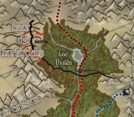 Les PJs arrivent de Syndoril au sud, longent la ligne de front verst l'ouest, s'engagent dans les Hauts de Hurleroche vers l'ouest puis remontent vers le nord. A un moment, il faut repartir vers l'est : et là traverser la faille nord - sud, en passant par un des 4 passages : un pont vide, un pont gardé par un géant du givre, un pont gardé par un ogre - mage, ou dernier choix le comptoir de Hurlevent.